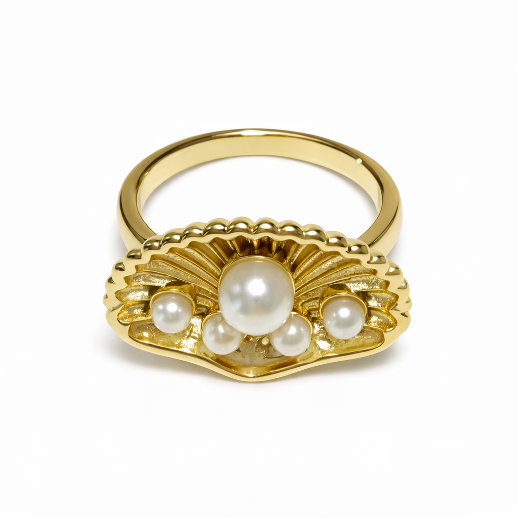 Anillo dorado de diseño elegante con estructura abierta y composición inspirada en una concha marina, decorado con múltiples perlas que aportan un estilo sofisticado y femenino. Su diseño combina lo clásico con un toque moderno, logrando una pieza delicada pero con presencia. La forma semicircular con relieves tipo concha crea un efecto visual armonioso, mientras las perlas de distintos tamaños generan un punto focal refinado. Su acabado pulido de alto brillo realza cada detalle, aportando luminosidad y elegancia. Un anillo ideal para complementar looks femeninos, desde estilos casuales hasta outfits más formales.