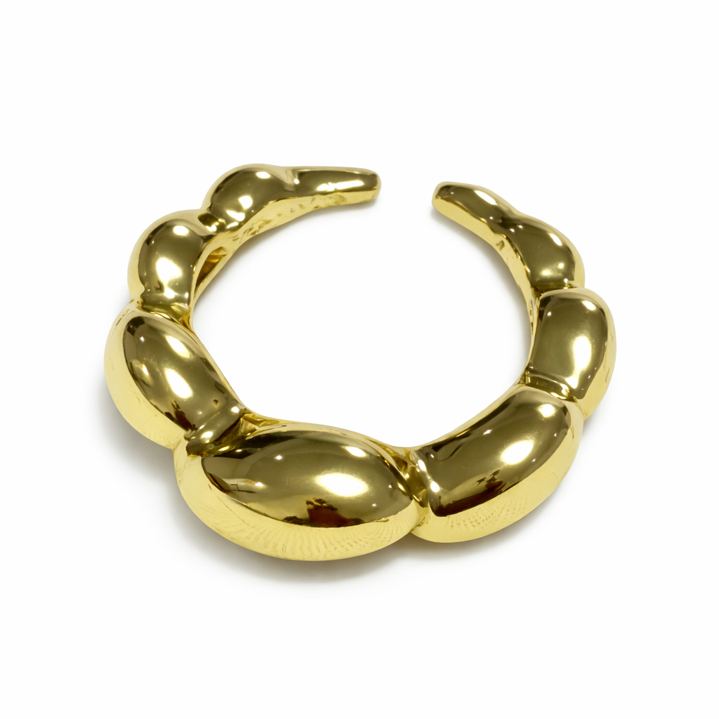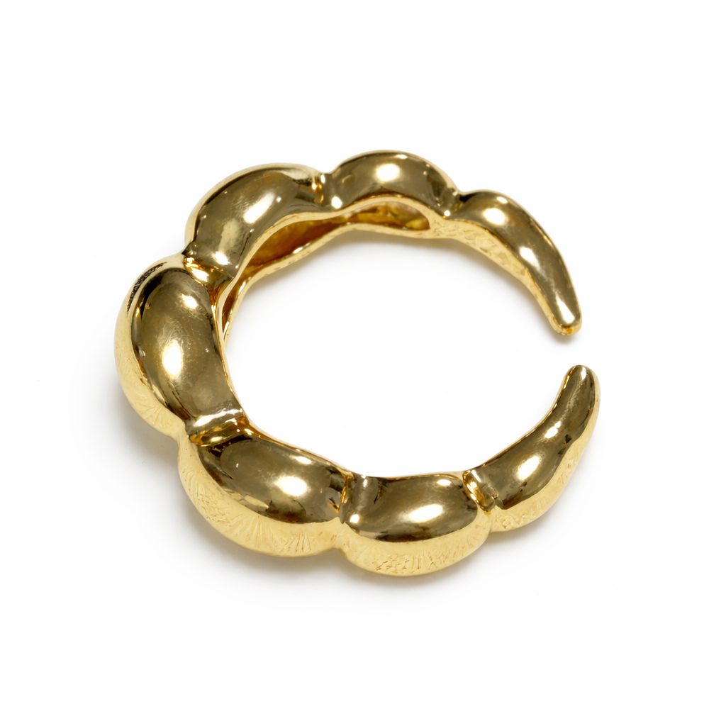 Anillo dorado de diseño moderno con estructura abierta y regulable, compuesto por volúmenes redondeados que crean una silueta orgánica y continua. Su diseño tipo “chunky” aporta presencia y estilo, manteniendo una estética elegante y contemporánea. Las formas abultadas generan un efecto visual dinámico y sofisticado, mientras su acabado pulido de alto brillo refleja la luz de manera uniforme. Su estructura envolvente lo convierte en una pieza cómoda y versátil para el uso diario. Un anillo ideal para quienes buscan accesorios modernos, llamativos y fáciles de combinar.