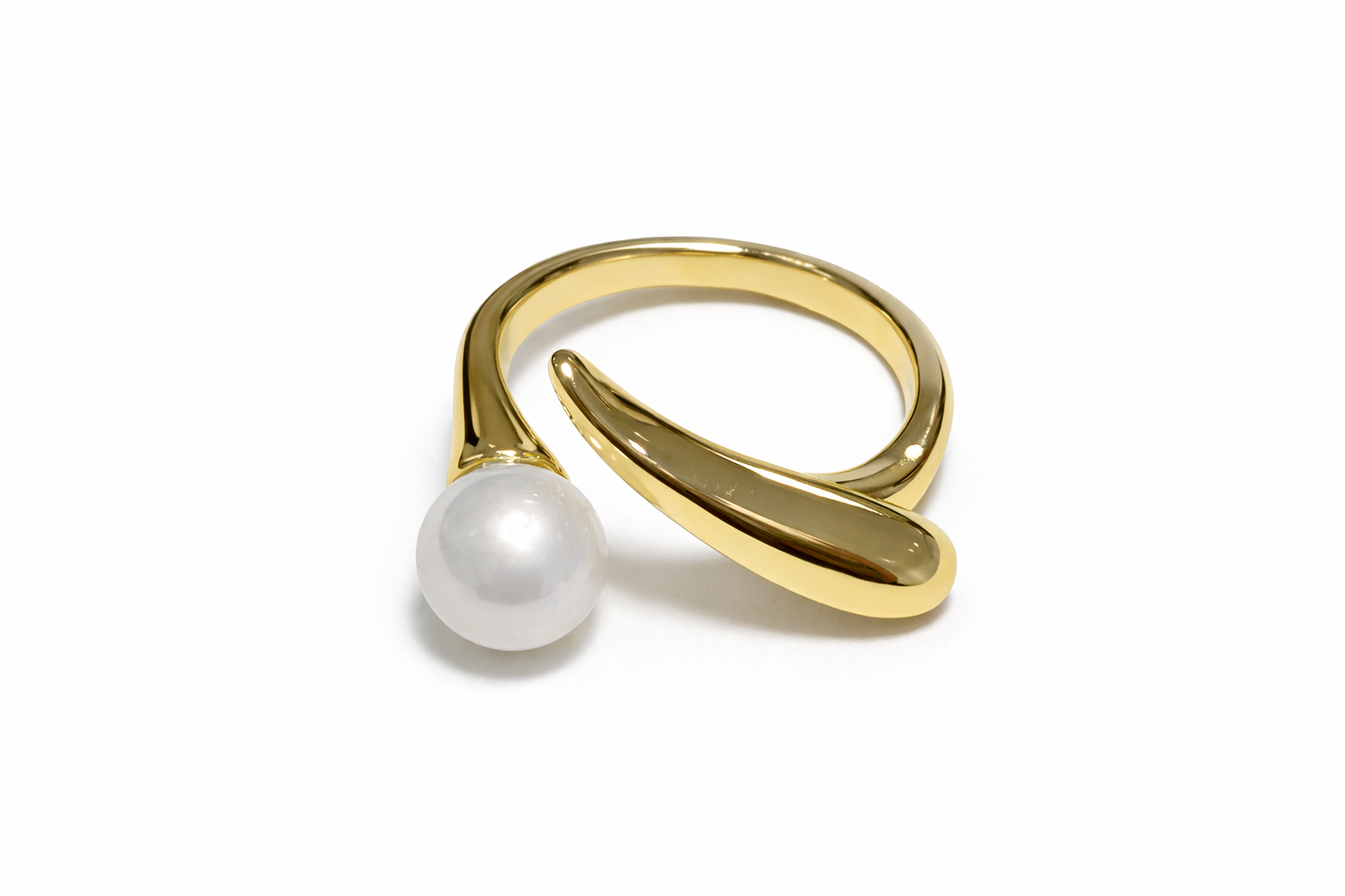 Anillo dorado de diseño elegante con estructura abierta y regulable, complementado con una perla decorativa que aporta un toque sofisticado y atemporal. Su diseño combina líneas suaves y orgánicas con un acabado pulido de alto brillo. La forma curva del anillo envuelve delicadamente el dedo, mientras la perla crea un punto focal sutil y femenino. Su estética minimalista lo convierte en una pieza versátil, ideal tanto para uso diario como para ocasiones especiales. Un anillo que equilibra modernidad y elegancia clásica, perfecto para clientas que buscan accesorios delicados pero con presencia.