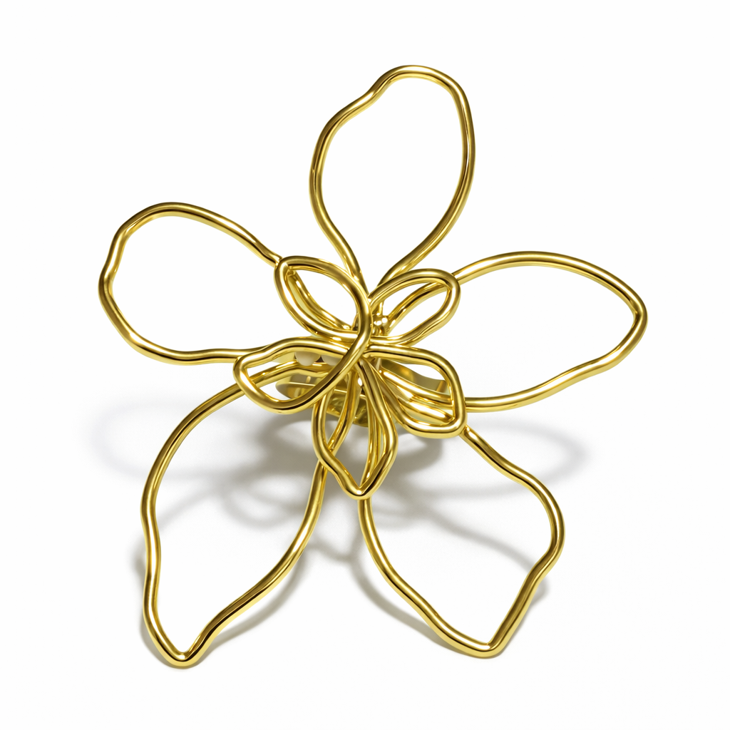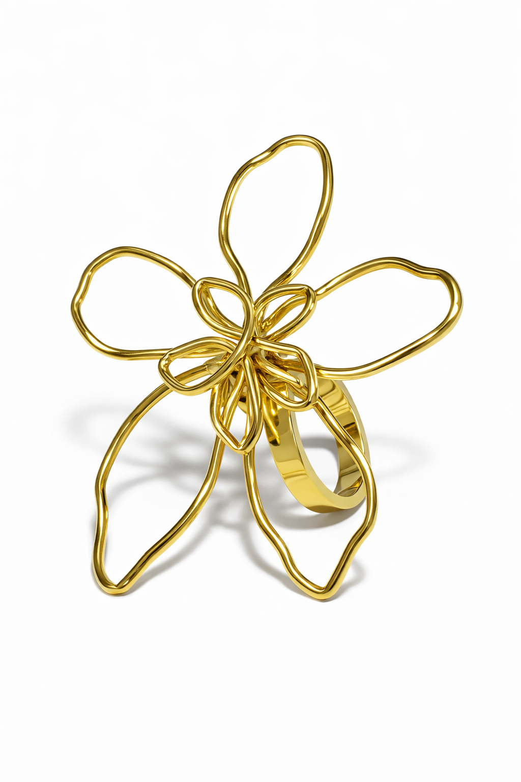 Anillo dorado de diseño escultural con estructura abierta y regulable, protagonizado por una flor formada por líneas metálicas continuas de trazo orgánico. Su diseño ligero y tridimensional crea una pieza artística con gran impacto visual. Los pétalos abiertos, delineados en forma irregular, generan una silueta amplia y dinámica que aporta movimiento y modernidad. A diferencia de los diseños volumétricos sólidos, este modelo destaca por su estética más ligera y conceptual, manteniendo elegancia y presencia. Un anillo statement ideal para quienes buscan accesorios únicos, con inspiración artística y estilo contemporáneo.