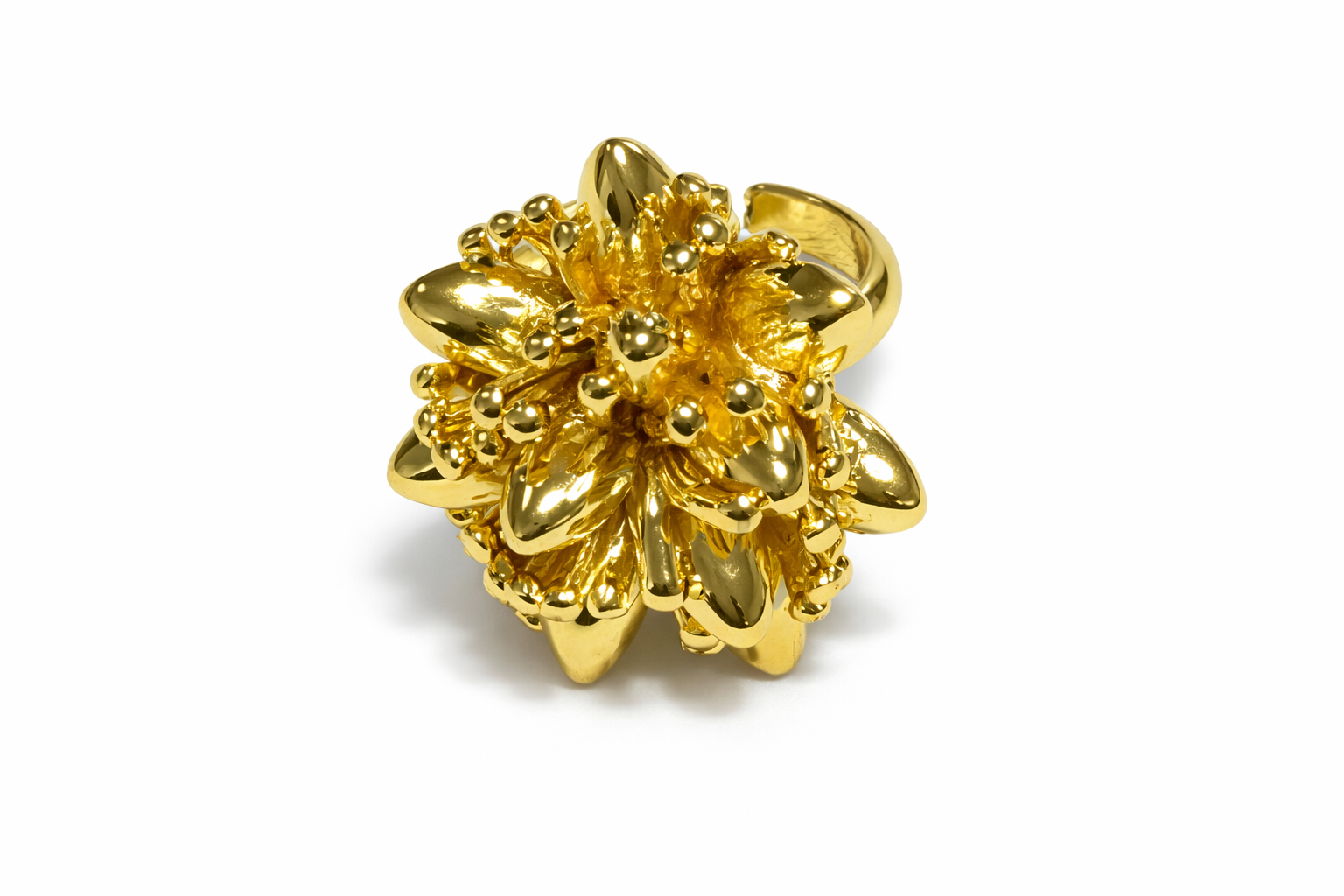 Anillo dorado de diseño escultural con estructura abierta y regulable, protagonizado por una flor de pétalos volumétricos con acabado pulido de alto brillo. Su diseño combina elegancia y modernidad, creando una pieza llamativa pero sofisticada. Los pétalos presentan formas orgánicas y suaves que reflejan la luz de manera dinámica, generando un efecto visual envolvente. Su estructura tridimensional aporta presencia sin perder armonía, convirtiéndolo en un accesorio ideal tanto para looks diarios como para ocasiones especiales. Un anillo statement que resalta la feminidad con un enfoque contemporáneo y refinado.