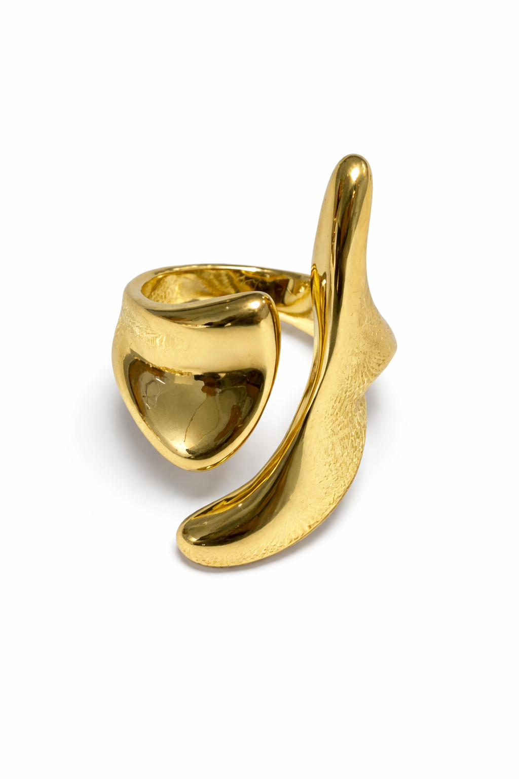 Anillo dorado de diseño escultural con estructura abierta y regulable, caracterizado por formas fluidas que evocan el movimiento del metal líquido. Su diseño orgánico y envolvente crea una pieza moderna, elegante y de gran impacto visual. Las curvas suaves y asimétricas generan un efecto dinámico que estiliza la mano, mientras su acabado pulido de alto brillo refleja la luz de manera uniforme. La combinación de superficies lisas con ligeras texturas aporta profundidad y sofisticación. Un anillo statement ideal para quienes buscan accesorios contemporáneos con estética minimalista pero con fuerte presencia.