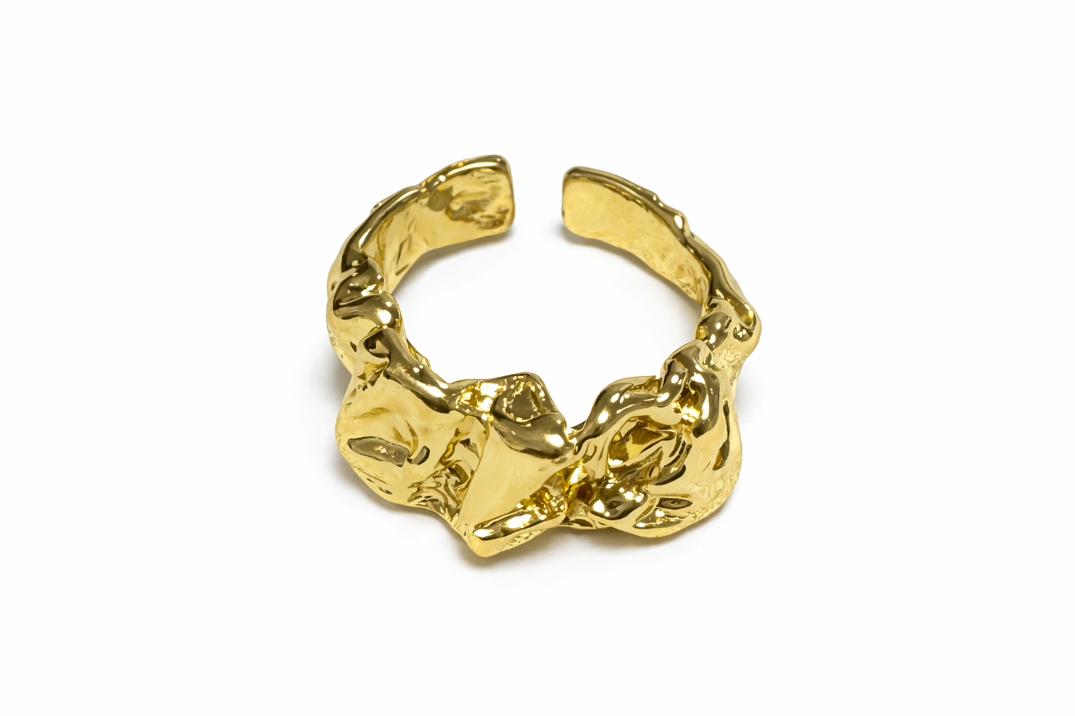 Anillo dorado de diseño escultural con estructura abierta y regulable, caracterizado por una superficie irregular con efecto martillado que simula una textura orgánica tipo metal fundido. Su diseño robusto y volumétrico aporta un estilo moderno con inspiración artesanal. Las formas asimétricas y la textura imperfecta crean un efecto visual único, destacando por su carácter auténtico y su acabado brillante. Su estructura abierta permite adaptarse cómodamente a diferentes tallas, ofreciendo funcionalidad sin perder impacto visual. Un anillo statement ideal para quienes buscan piezas con personalidad, textura y un estilo contemporáneo distintivo.