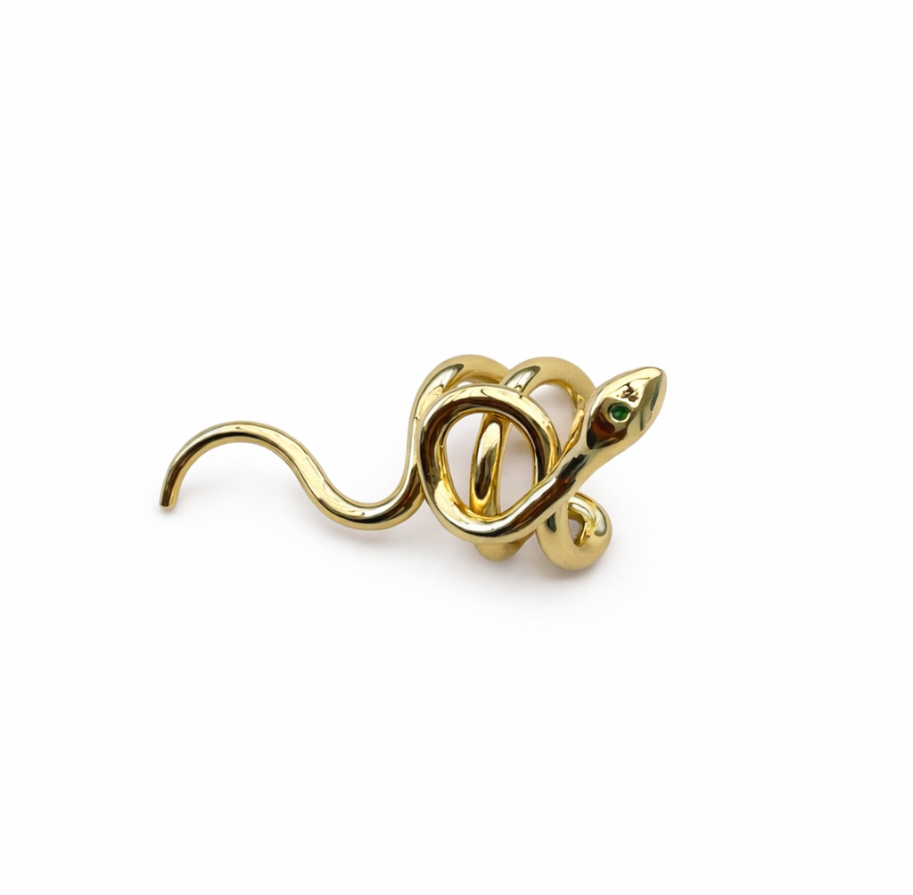 Anillo dorado de diseño escultural con estructura abierta y regulable, inspirado en la silueta de una serpiente que se envuelve de forma elegante alrededor del dedo. Su diseño fluido y continuo aporta dinamismo, sensualidad y carácter. La figura presenta curvas suaves que simulan el movimiento natural del reptil, mientras su acabado dorado de alto brillo resalta cada detalle. Los ojos en tono verde añaden un punto de contraste que eleva la pieza y la hace aún más llamativa. Un anillo statement ideal para quienes buscan un accesorio audaz, moderno y con personalidad.