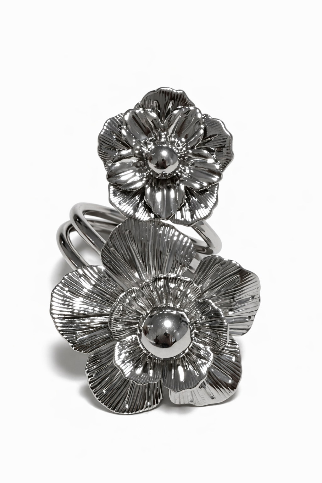 Anillo plateado de diseño escultural con estructura abierta y regulable, protagonizado por una composición de doble flor con textura en relieve. Su diseño combina volumen, detalle y elegancia, creando una pieza llamativa y sofisticada. Las flores presentan pétalos con líneas marcadas que generan un efecto de profundidad y movimiento, mientras los centros esféricos aportan equilibrio visual. Su acabado plateado de alto brillo resalta cada textura, logrando un accesorio moderno con gran presencia. Un anillo statement ideal para destacar cualquier look con un estilo femenino y contemporáneo.