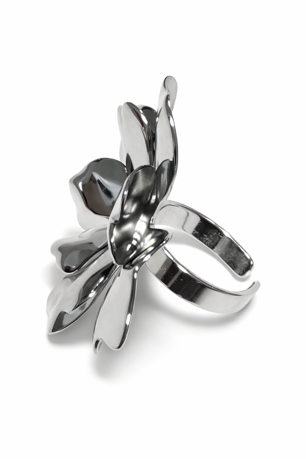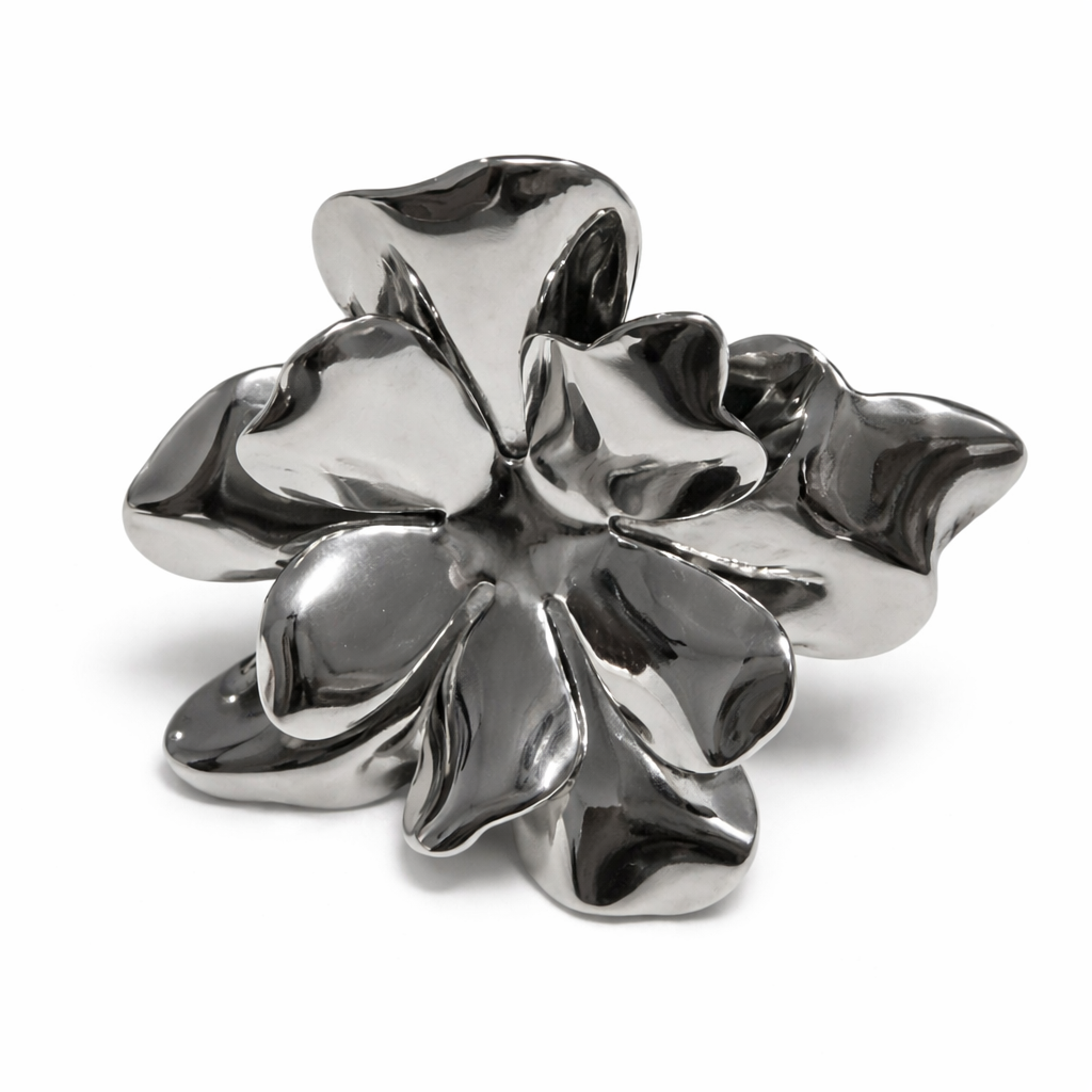 Anillo plateado de diseño escultural con estructura abierta y regulable, protagonizado por una flor de pétalos volumétricos con acabado pulido de alto brillo. Su diseño combina elegancia y modernidad, logrando una pieza llamativa pero sofisticada. Los pétalos presentan formas orgánicas y suaves que reflejan la luz de manera dinámica, generando un efecto envolvente. Su estructura tridimensional aporta presencia sin perder armonía, convirtiéndolo en un accesorio ideal tanto para el uso diario como para ocasiones especiales. Un anillo statement que resalta la feminidad con un enfoque contemporáneo.