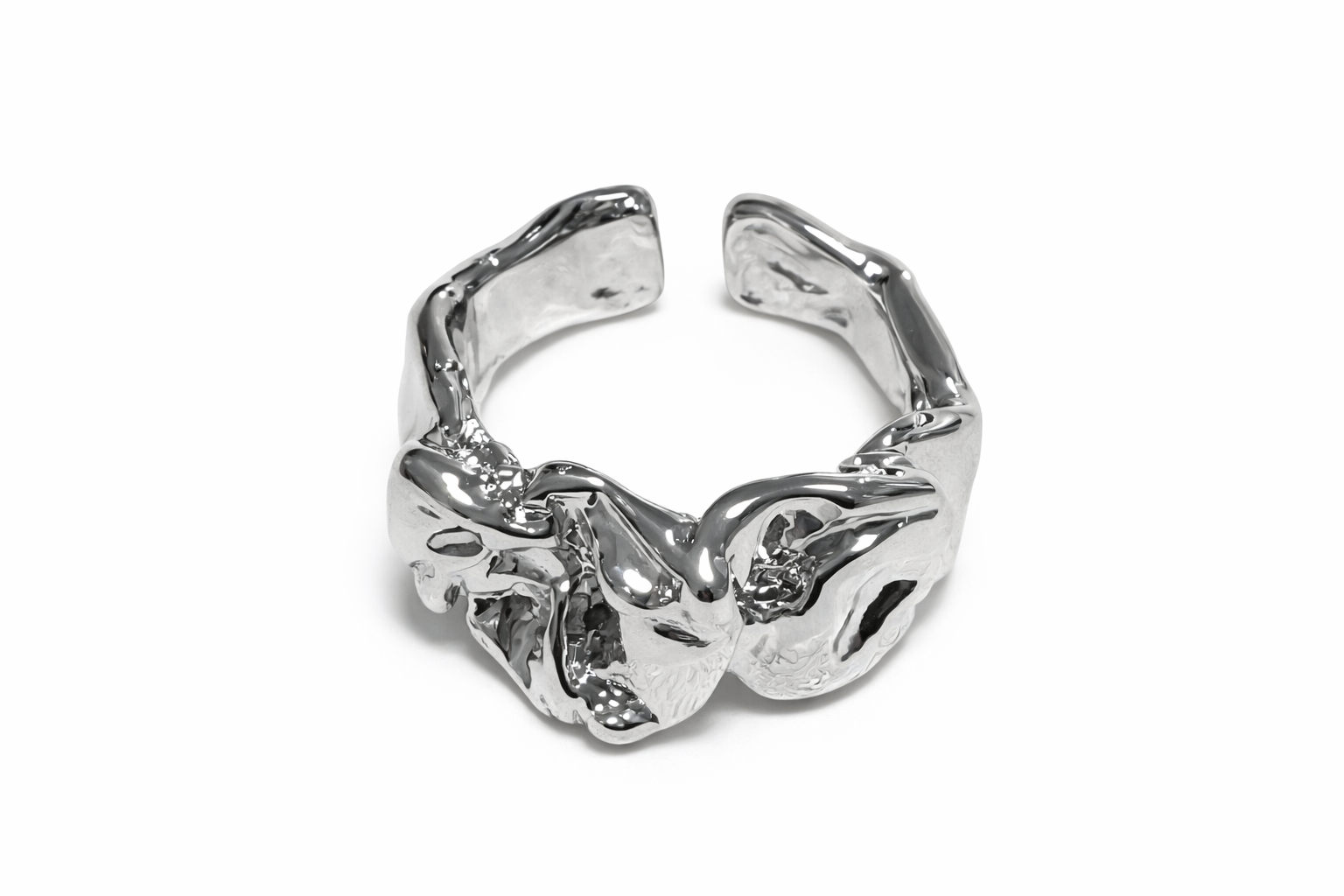 Anillo plateado de diseño escultural con estructura abierta y regulable, inspirado en formas orgánicas que evocan el metal fundido. Su superficie irregular y texturizada crea una pieza moderna, con carácter y fuerte presencia visual. El diseño presenta volúmenes asimétricos que generan profundidad y dinamismo, mientras su acabado plateado de alto brillo resalta las distintas facetas de la pieza. Su estilo contemporáneo lo convierte en un accesorio ideal para looks urbanos y sofisticados. Un anillo statement perfecto para quienes buscan diseños diferentes, con estética artística y moderna.