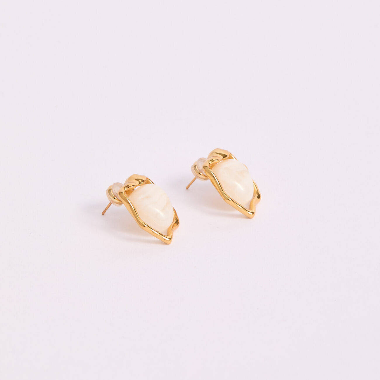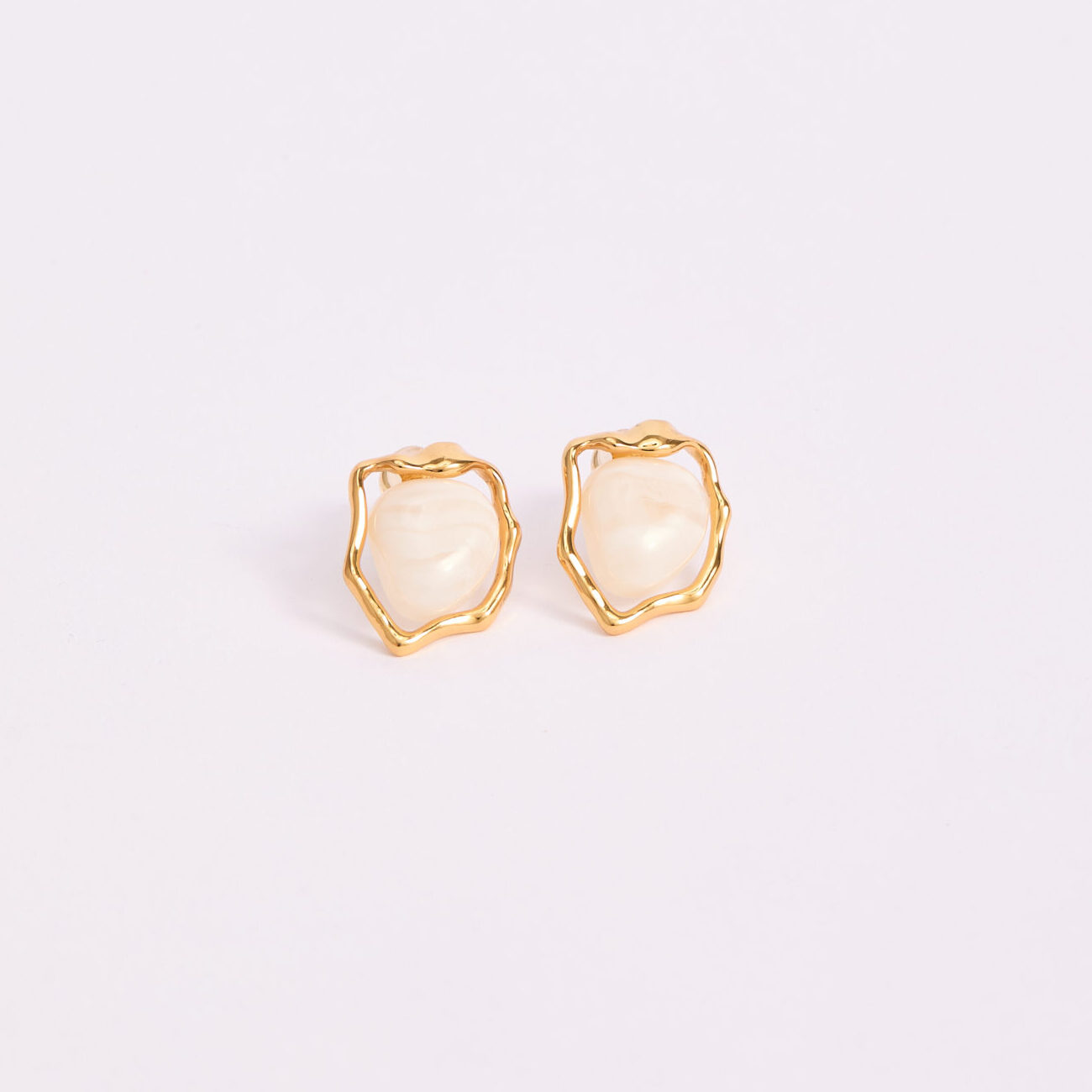 Silencio elegante, un marco orgánico dorado que abraza una pieza tipo nácar en tono crema. Minimalista, moderno y fácil de combinar día y noche.