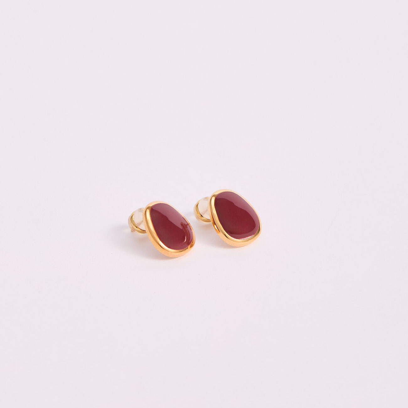 Aretes de forma ovalada con centro en tono rubí profundo, enmarcado en estructura dorada pulida. Un diseño elegante y atemporal que aporta sofisticación y carácter.