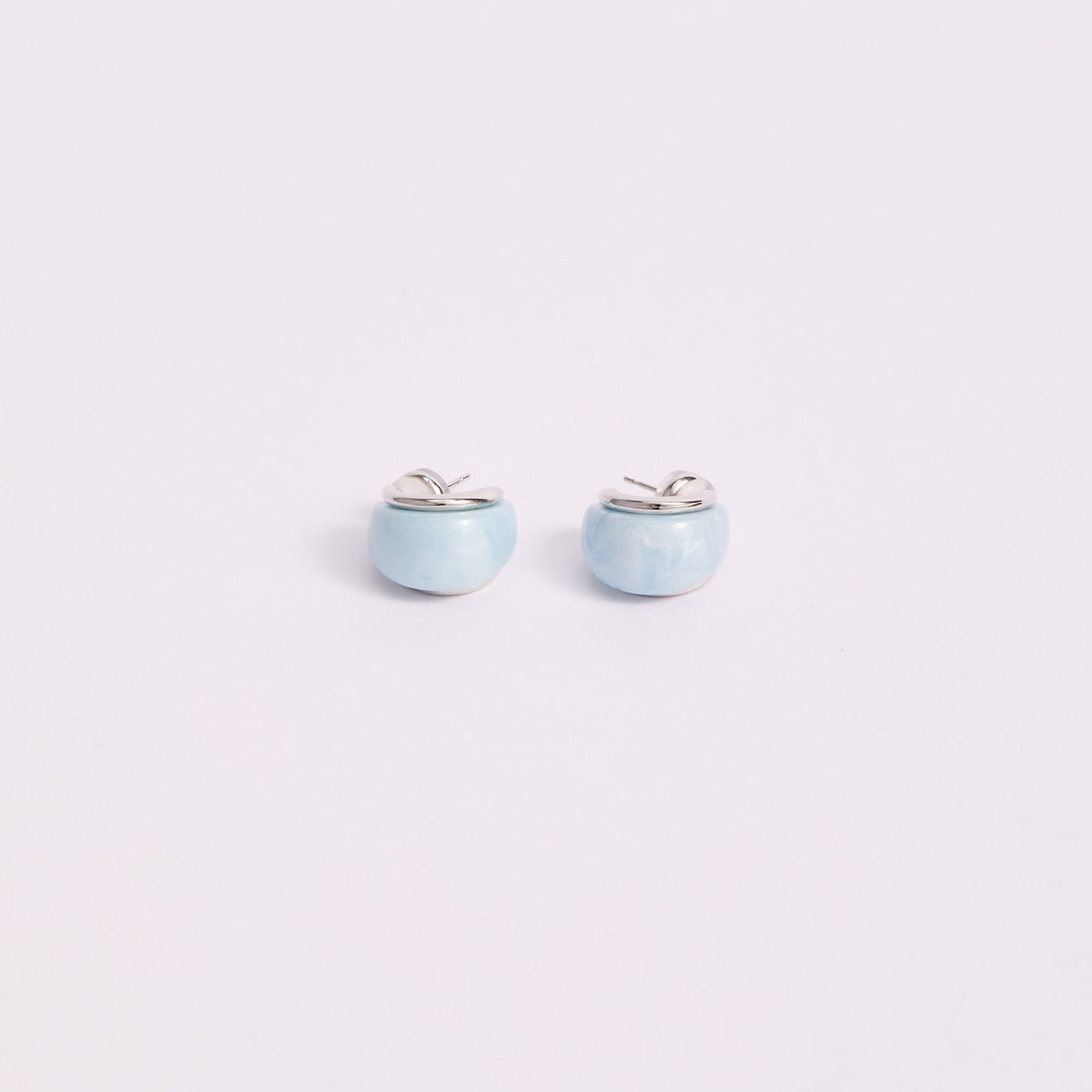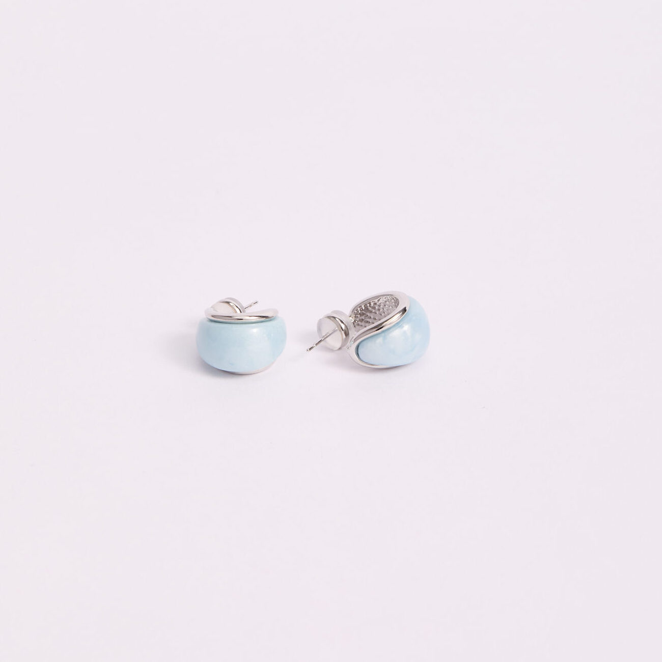 Aretes de diseño contemporáneo con silueta domed y cuerpo en tono celeste opaco de acabado glaseado, enmarcados por un detalle plateado pulido que aporta contraste y sofisticación. El resultado es una pieza moderna, limpia y con un aire elegante, perfecta para quienes buscan un accesorio diferente sin caer en lo recargado.