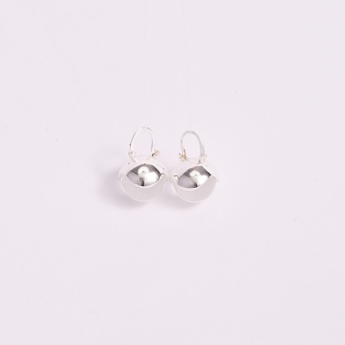Aretes colgantes de diseño moderno con forma esférica y acabado bicolor, que combinan una superficie exterior blanca opaca de brillo suave con un interior plateado de acabado espejo. Esta dualidad de tonos y texturas crea una pieza contemporánea, elegante y visualmente impactante, perfecta para quienes buscan accesorios distintos y bien definidos.