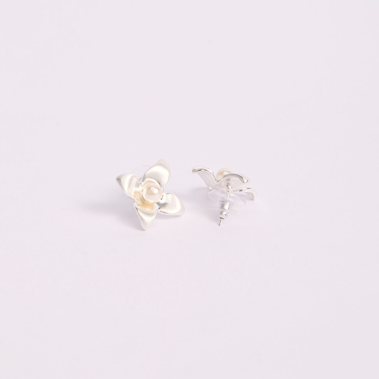 Aretes plateados de diseño floral con pétalos de acabado satinado y detalle central tipo perla, que aporta un contraste delicado y femenino. Su forma orgánica y textura suave reflejan la luz de manera sutil, convirtiéndolos en un accesorio elegante y versátil, ideal para complementar looks diarios o elevar outfits más sofisticados con un toque clásico y moderno a la vez.