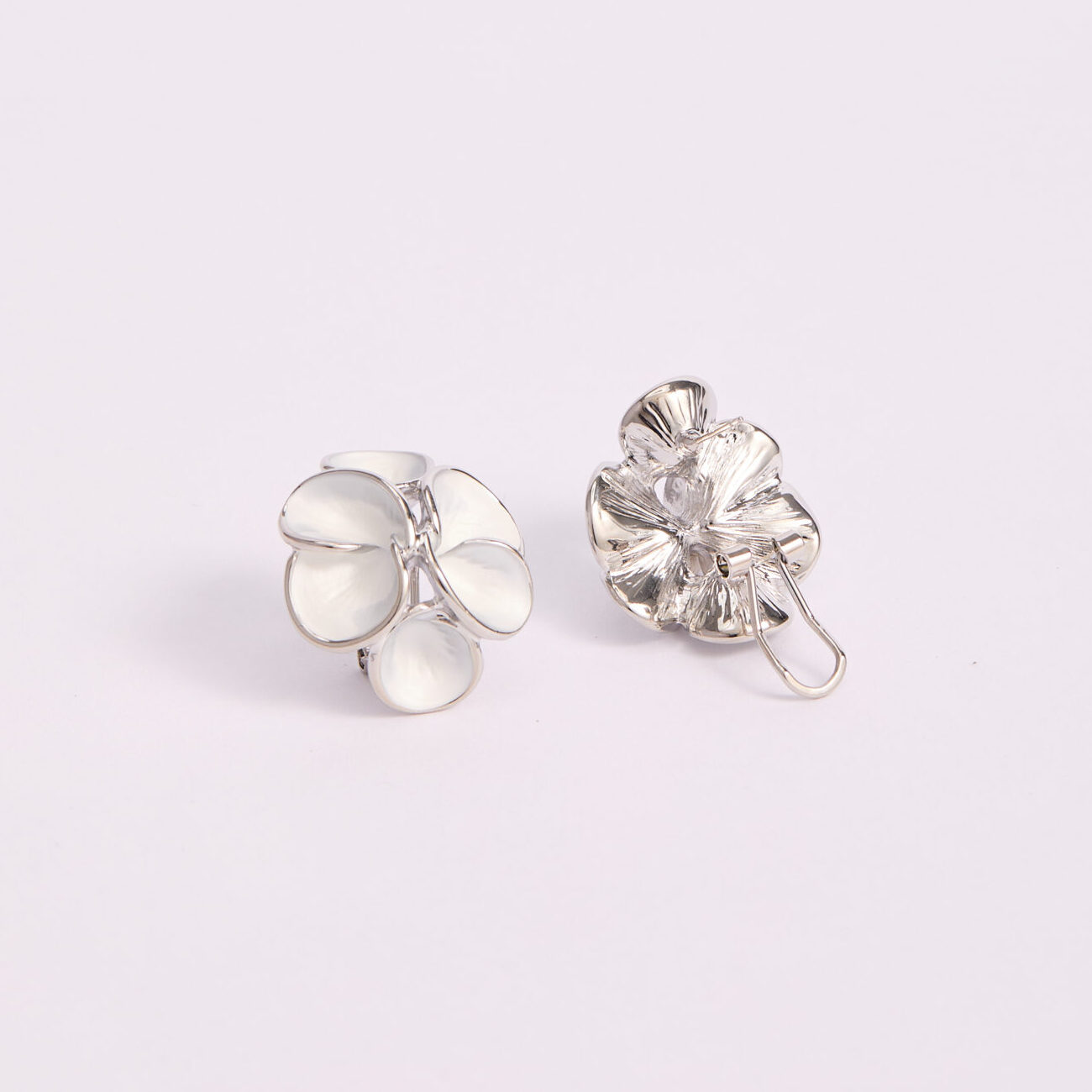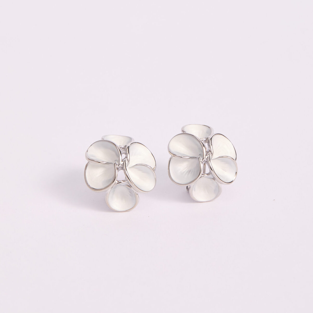 Aretes plateados de diseño floral con pétalos de apariencia translúcida que reflejan la luz de forma suave y delicada. Su forma orgánica y volumen equilibrado los convierten en un accesorio elegante y femenino, ideal para aportar frescura y luminosidad a looks diarios o complementar outfits más sofisticados.
