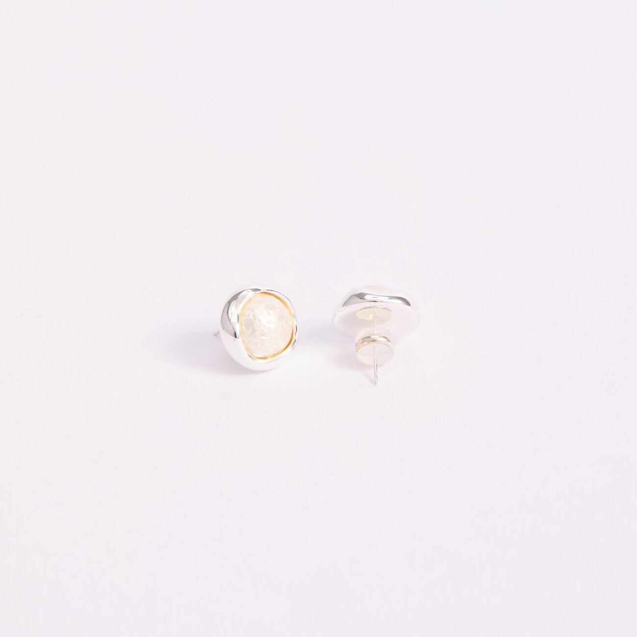 Aretes plateados de diseño orgánico con centro de apariencia perlada y textura natural, enmarcados por un contorno irregular de acabado brillante. Su volumen equilibrado y contraste de superficies los convierte en una pieza elegante y moderna, ideal para elevar looks sobrios o complementar outfits sofisticados con un toque distintivo y femenino.