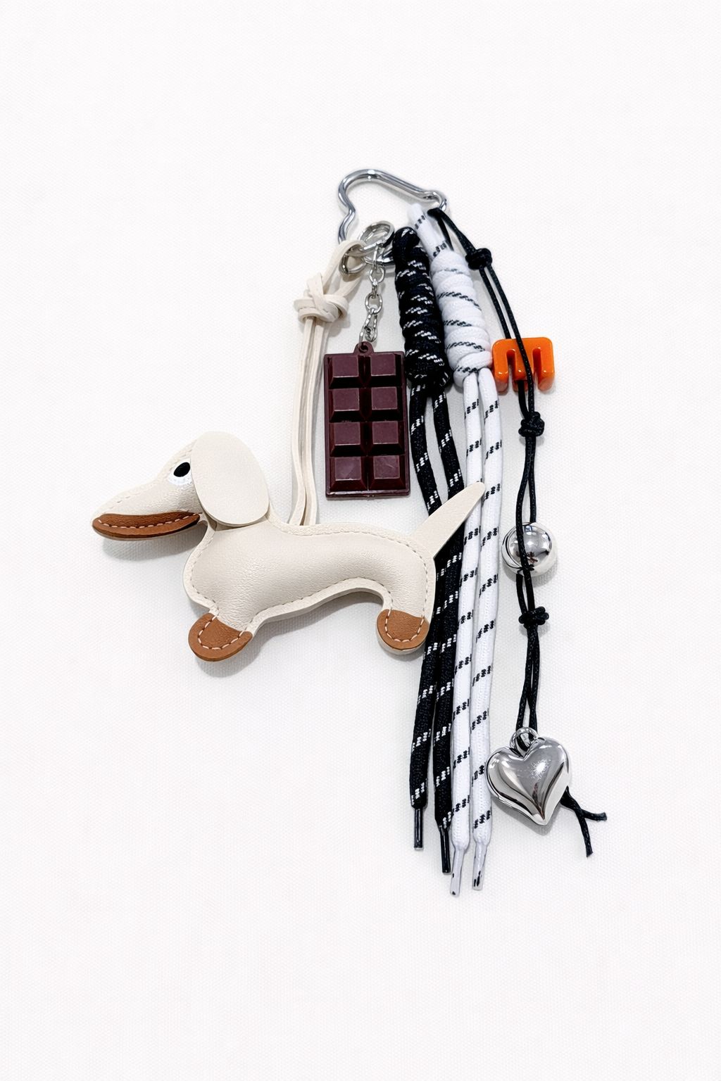 Bag charm decorativo con diseño original compuesto por un dije de perro estilizado acompañado de distintos elementos colgantes que aportan movimiento y personalidad al accesorio. El diseño incluye cordones textiles, pequeños dijes metálicos y piezas decorativas que crean un estilo moderno y divertido. Entre sus detalles destacan un dije con forma de chocolate, un dije metálico en forma de corazón y cuentas decorativas que complementan el conjunto. La combinación de materiales y colores crea un accesorio llamativo, ideal para personalizar bolsos, mochilas o llaveros. Un bag charm perfecto para quienes buscan añadir un toque creativo y distintivo a sus accesorios.