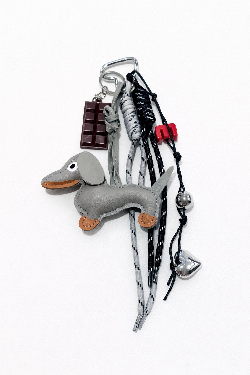 Bag charm decorativo con diseño divertido compuesto por un dije de perro estilo dachshund en tono gris acompañado de distintos elementos colgantes que aportan movimiento y estilo al accesorio. El diseño incluye un dije decorativo con forma de chocolate, cordones textiles y pequeños dijes metálicos que complementan el conjunto. La combinación de tonos neutros y detalles metálicos crea un accesorio moderno y versátil, ideal para personalizar bolsos, mochilas o llaveros. Su estética creativa y llamativa lo convierte en un complemento perfecto para añadir personalidad y estilo a cualquier accesorio. Un bag charm ideal para quienes buscan un detalle original y moderno para su bolso