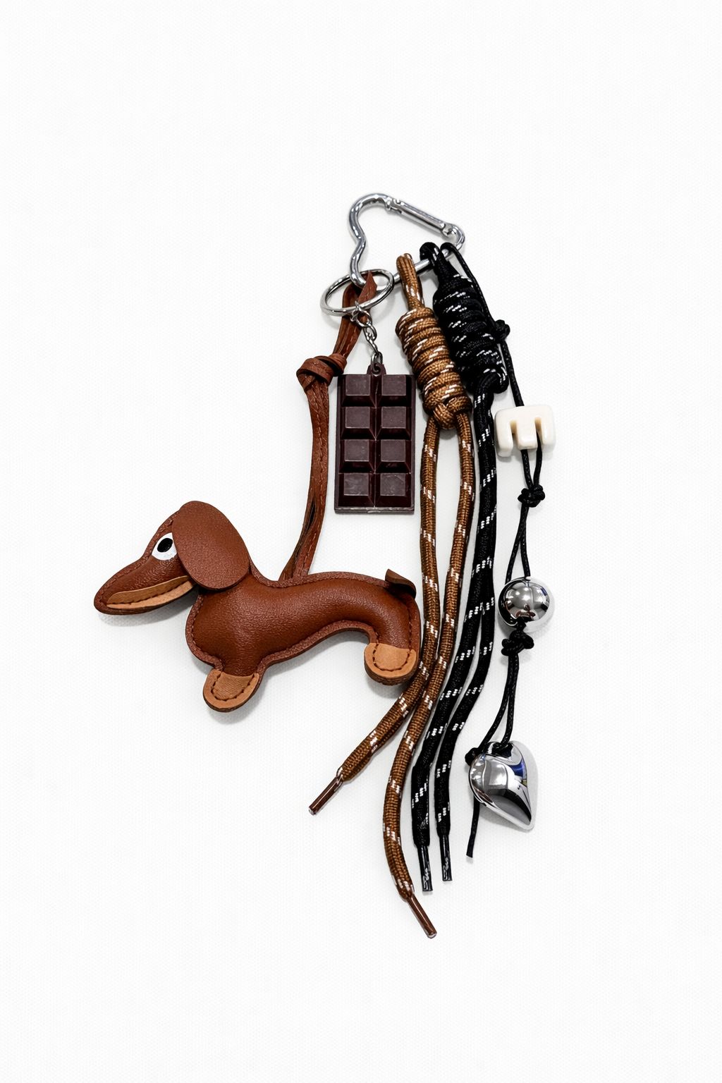 Bag charm decorativo con diseño divertido compuesto por un dije de perro estilo dachshund en tono marrón acompañado de diversos elementos colgantes que aportan movimiento y personalidad al accesorio. El diseño incluye un dije decorativo con forma de chocolate, cordones textiles y pequeños dijes metálicos que crean una composición dinámica y llamativa. La combinación de materiales, texturas y colores neutros crea un accesorio moderno y original, ideal para personalizar bolsos, mochilas o llaveros. Su estilo creativo lo convierte en un complemento perfecto para quienes buscan añadir un toque distintivo y divertido a sus accesorios. Un bag charm ideal para aportar estilo y personalidad al uso diario.