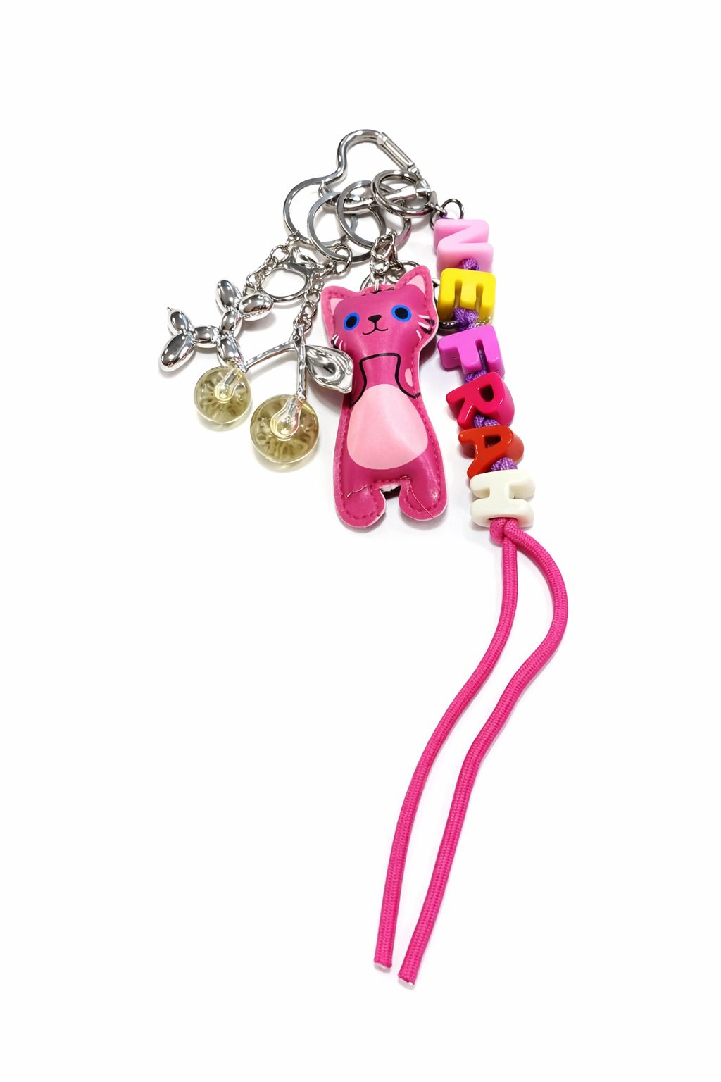 Bag charm decorativo con diseño divertido compuesto por un dije de gato fucsia acompañado de letras multicolor que forman la palabra “NEFRAH”. El accesorio incluye además pequeños dijes colgantes con esferas decorativas y detalles metálicos que aportan movimiento y brillo. Su combinación de colores vibrantes y elementos colgantes crea un accesorio juvenil, llamativo y lleno de personalidad, ideal para personalizar bolsos, mochilas o llaveros. Este diseño aporta un toque creativo y distintivo que resalta cualquier accesorio del día a día. Un bag charm perfecto para quienes buscan añadir estilo, color y originalidad a su bolso.