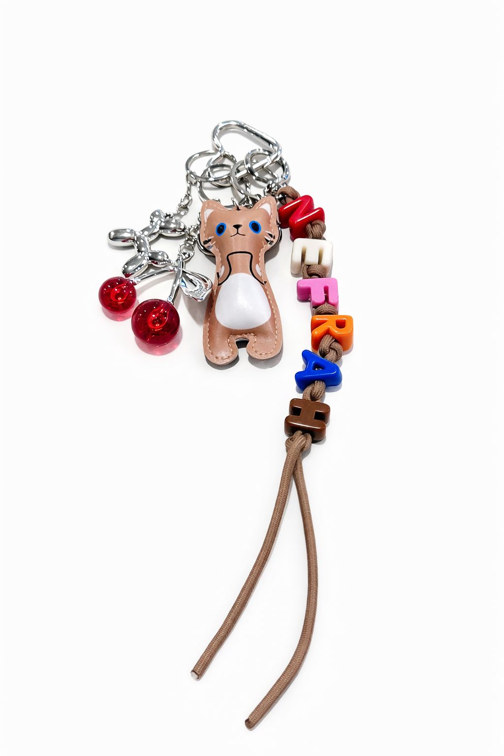 Bag charm decorativo con diseño divertido inspirado en un gato estilizado acompañado de dijes y letras coloridas NEFRAH. El accesorio combina elementos metálicos y piezas decorativas que crean un estilo juvenil, creativo y lleno de personalidad. Las letras multicolor y los dijes colgantes aportan movimiento y dinamismo al diseño, convirtiéndolo en un complemento ideal para personalizar bolsos, mochilas o llaves. Su estética alegre lo convierte en una pieza llamativa que destaca en cualquier accesorio. Un bag charm perfecto para quienes buscan añadir un toque original y divertido a su bolso.