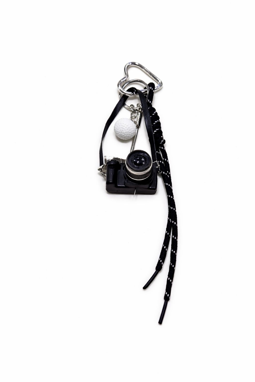 Bag charm decorativo inspirado en el estilo de una cámara fotográfica vintage. El diseño combina un dije de cámara en miniatura con elementos metálicos y cordones textiles que aportan un estilo urbano y moderno. El conjunto incluye detalles colgantes que generan movimiento y volumen, creando un accesorio llamativo y original. Su combinación de tonos negros y plateados lo convierte en un complemento versátil que puede personalizar bolsos, mochilas o llaves con un toque contemporáneo. Una pieza ideal para quienes buscan accesorios diferentes con personalidad.