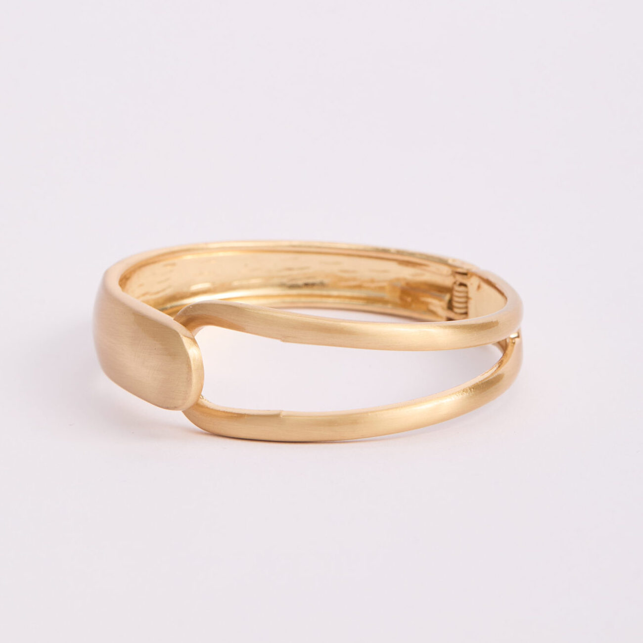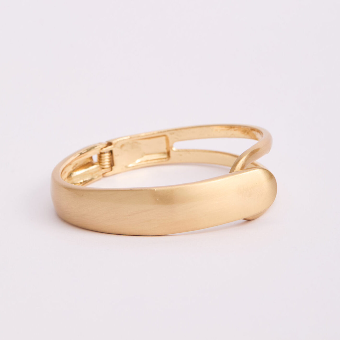 Brazalete rígido de diseño contemporáneo con líneas curvas y superposición frontal, elaborado en metal con acabado dorado satinado que le da un brillo elegante y sofisticado, sin ser excesivo. Su estructura abierta con sistema de bisagra interna permite un calce cómodo, firme y seguro en la muñeca. Es una pieza protagonista, ideal para elevar cualquier look, desde outfits diarios hasta combinaciones más elegantes de noche.