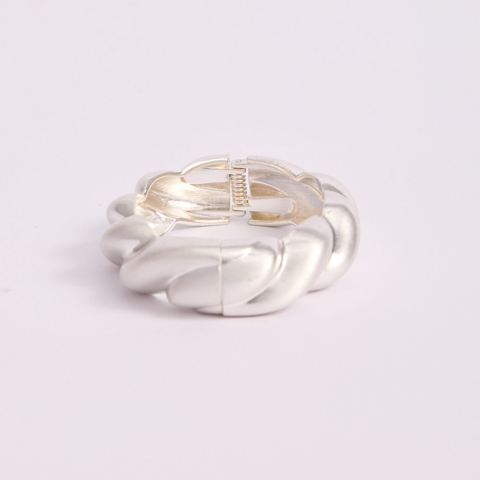 Brazalete de diseño trenzado con volumen marcado y estructura sólida. Su forma tipo eslabones entrelazados aporta carácter, fuerza visual y presencia en muñeca. Es una pieza protagonista, pensada para mujeres que buscan accesorios impactantes, modernos y con estética contemporánea. El acabado plateado espejo realza el relieve del trenzado y refleja la luz de manera elegante, convirtiéndolo en un accesorio ideal tanto para looks minimalistas como para combinaciones más arriesgadas. Diseño estructural rígido con sistema de cierre seguro que brinda firmeza y comodidad al usarlo.