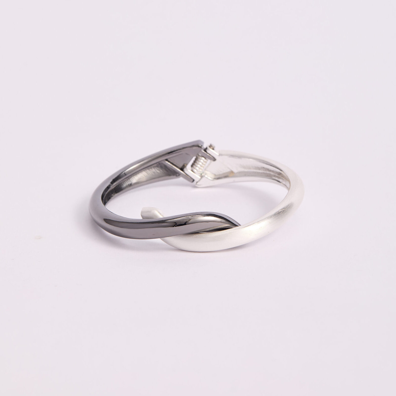 Brazalete de diseño contemporáneo con estructura entrelazada en acabado bicolor: una mitad en tono plateado espejo y la otra en tono gunmetal oscuro de alto brillo. Su forma curva y orgánica crea un efecto visual dinámico, donde ambos tonos se cruzan suavemente generando profundidad y contraste elegante. Es una pieza con carácter fuerte, sofisticada y moderna, ideal para mujeres que buscan accesorios con presencia sin necesidad de exceso de volumen. El contraste metálico aporta un aire arquitectónico y minimalista, perfecta para estilismos monocromáticos, looks ejecutivos o outfits urbanos de alto impacto.