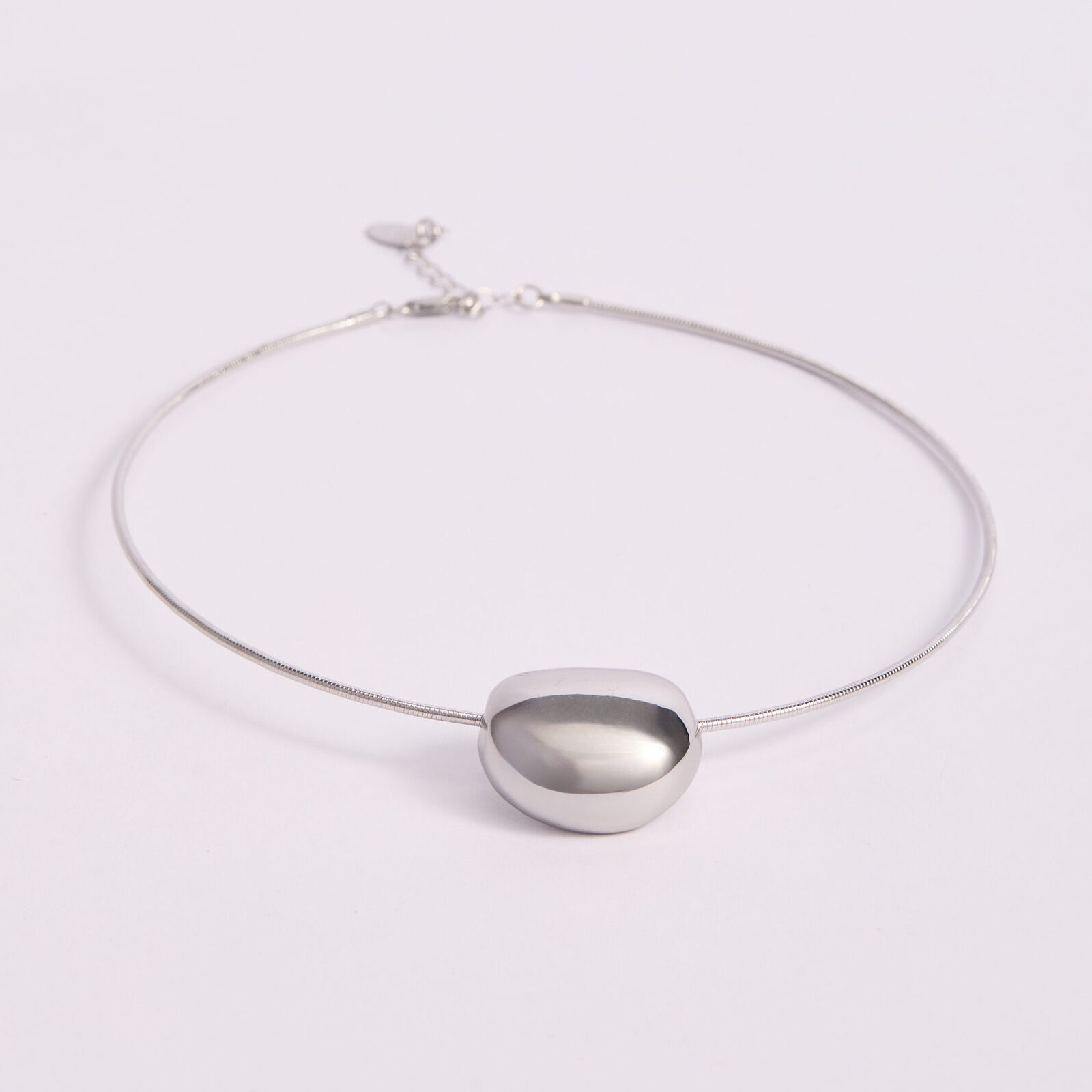 Collar de diseño minimalista con cadena fina en tono plateado y dije central de forma orgánica, suave y redondeada. La pieza destaca por su volumen compacto y acabado espejo, aportando elegancia sin recargar el look. Su estética limpia y contemporánea lo convierte en un accesorio versátil, ideal para uso diario, outfits ejecutivos o combinaciones monocromáticas. Es una pieza sobria, moderna y fácil de integrar en cualquier estilo. Perfecto para mujeres que buscan accesorios discretos pero con presencia.