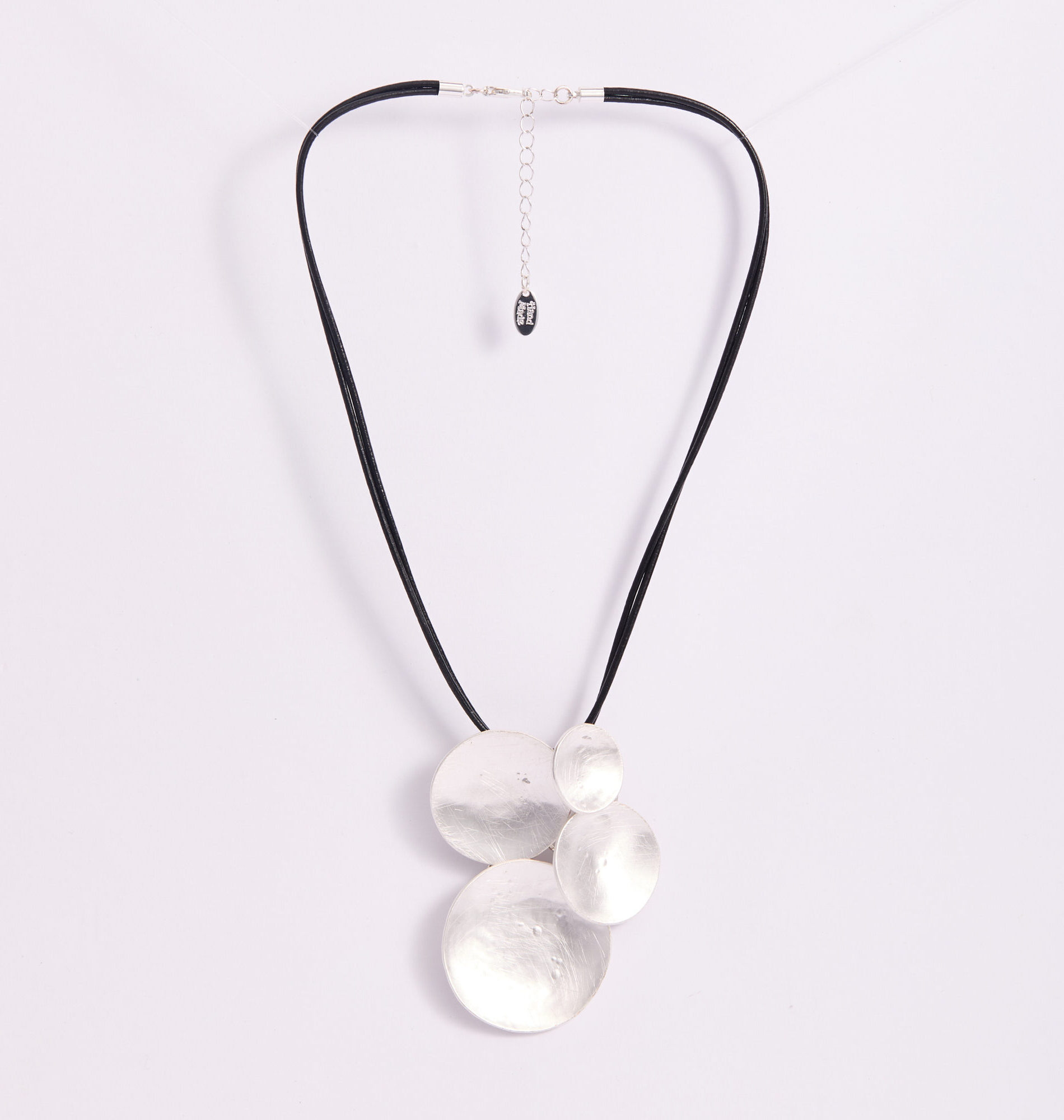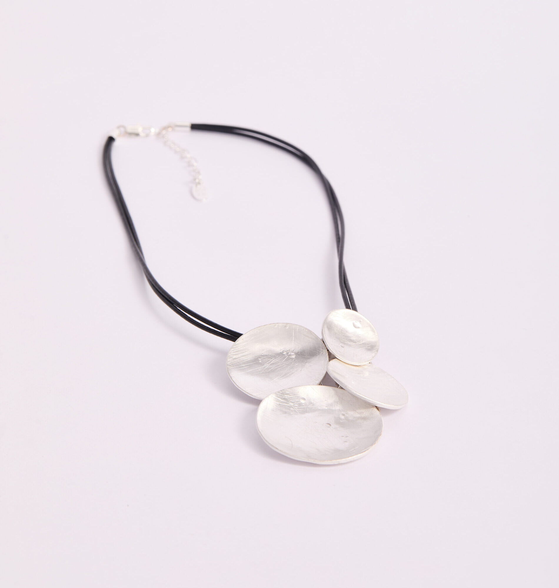 Collar de diseño contemporáneo compuesto por múltiples discos metálicos superpuestos en acabado plateado texturizado, montados sobre doble cordón negro estructural. La combinación del metal martillado con el contraste del cordón oscuro crea una pieza moderna, artística y de alto impacto visual. Es un accesorio protagonista, ideal para elevar prendas básicas y aportar carácter a looks minimalistas. Diseño audaz, elegante y con presencia escultural.