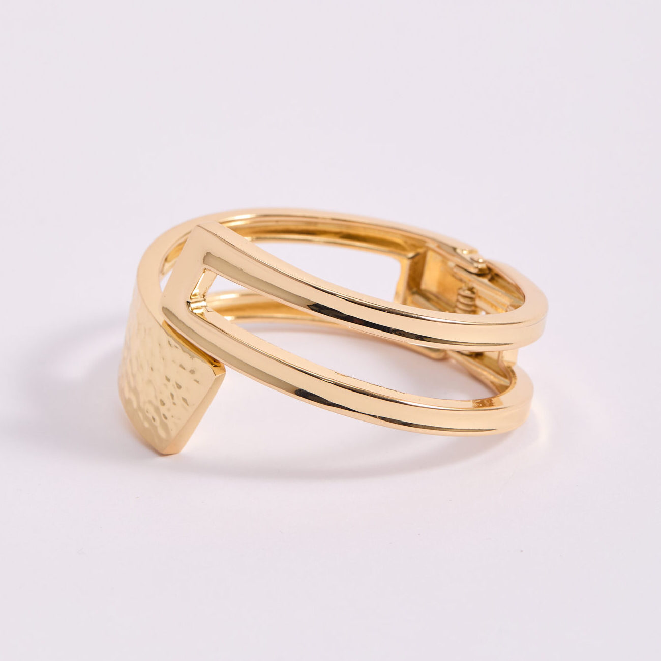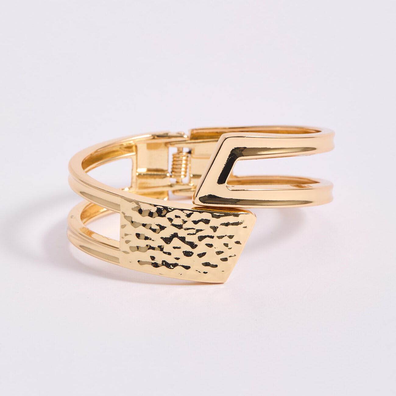 Pulsera tipo brazalete de diseño moderno y estructural, elaborada en acabado dorado de alto brillo. Su diseño combina líneas limpias y geométricas con una placa frontal de textura martillada, creando un contraste elegante entre superficies pulidas y relieve orgánico. Es una pulsera pensada para mujeres que buscan accesorios con fuerza estética y diseño actual. Funciona perfectamente como pieza central, tanto para looks de día como para outfits más elegantes de noche. Ideal para combinar con prendas neutras, sastreras o estilismos minimalistas donde el accesorio marque la diferencia.